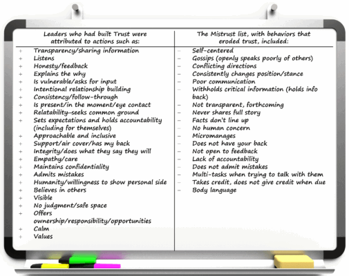Our next step was to identify a leader we trusted, and one who gave a feeling of mistrust. The group then began listing behaviors and actions that showed up when trust was felt and behaviors that caused mistrust: